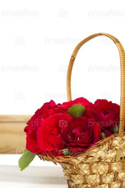 Красные розы в плетеной корзине на белом фоне