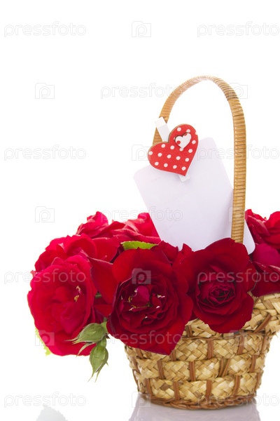 Красные розы и открытка в плетеной корзине на белом фоне