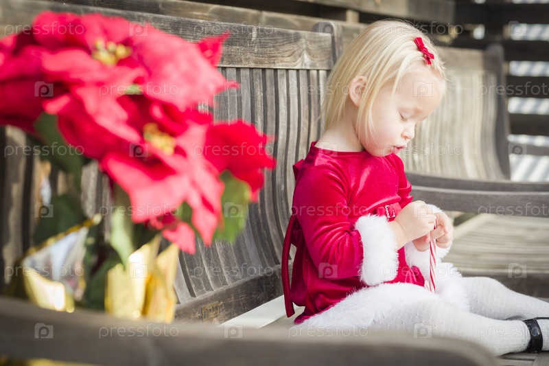 Очаровательная девочка с конфетой сидит на скамье