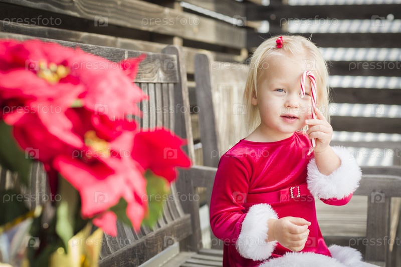 Очаровательная девочка с конфетой сидит на скамье