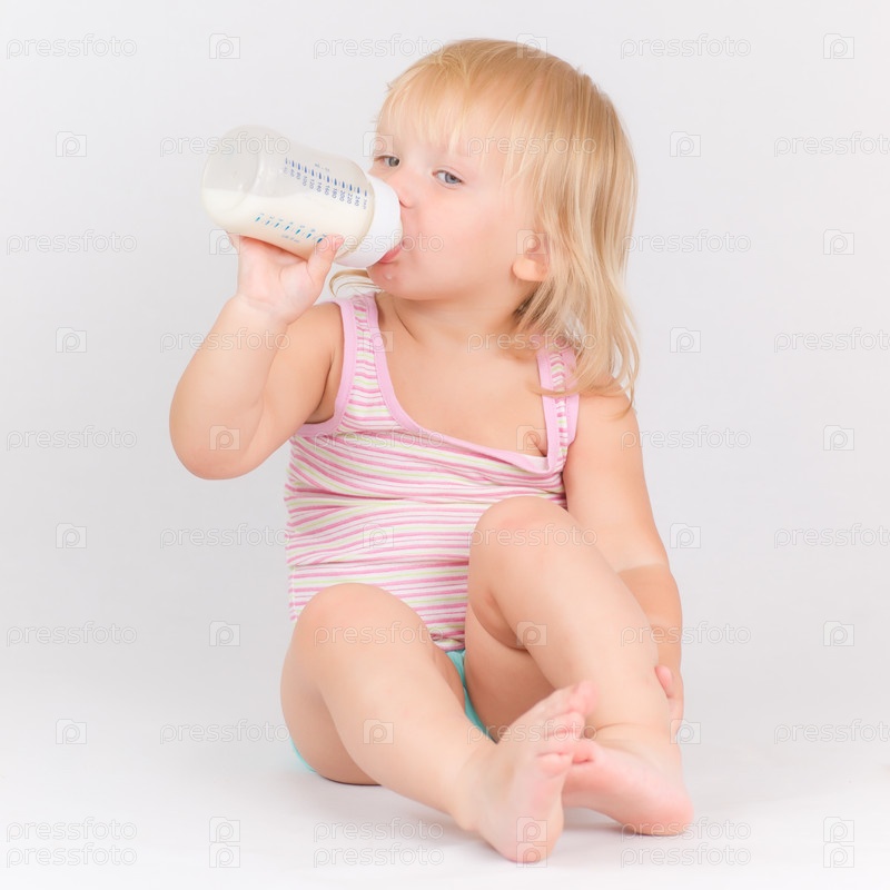 Очаровательный ребенок пьет молоко из бутылочки на белом фоне