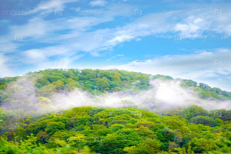 Зеленый лес, голубое небо и туман