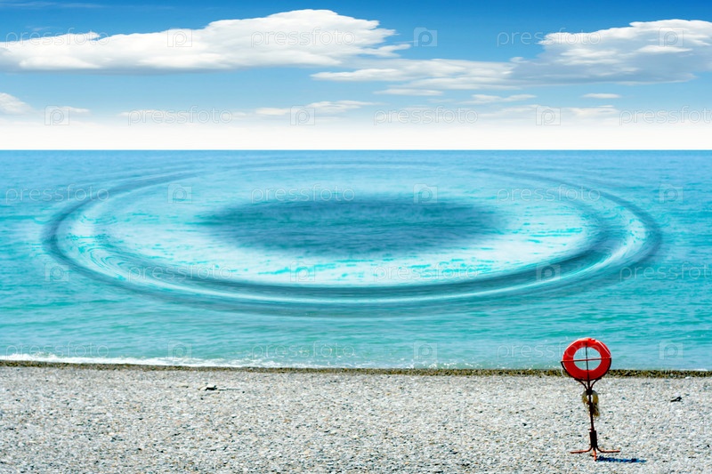 Морской берег со спасательным кругом и кругами на воде