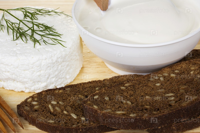 Свежая сметана, творог и хлеб