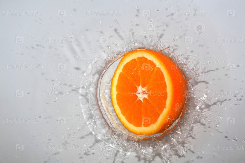 Половинка апельсина в брызгах воды