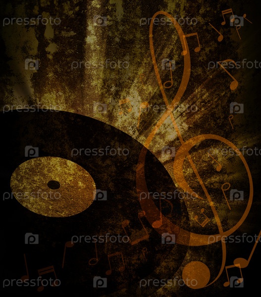 Темный фон с музыкальным ключом, нотами и пластинкой
