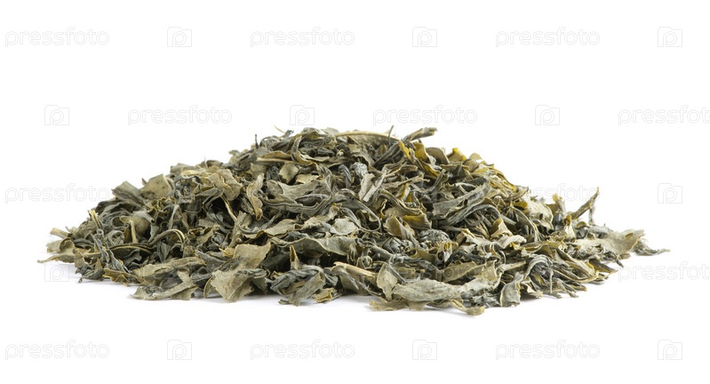 Сухие листья зеленого чая, изолированные на белом фоне