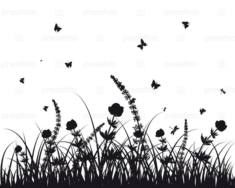 Силуэты травы и цветов на белом фоне