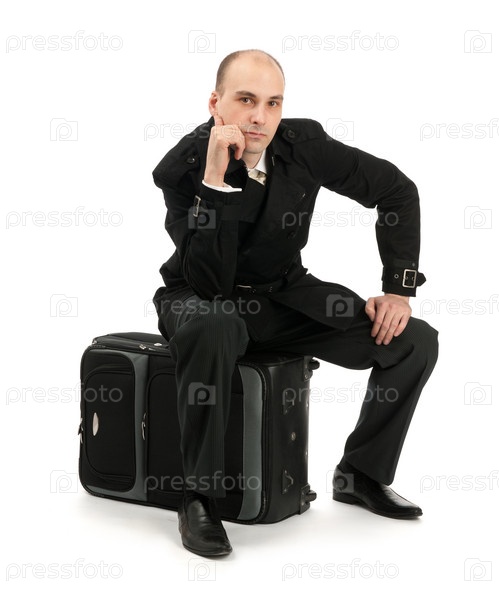 Портрет молодого бизнесмена, сидящего на чемодане