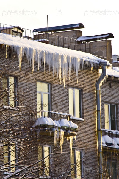 Сосульки, свисающие с крыши и балкона жилого дома