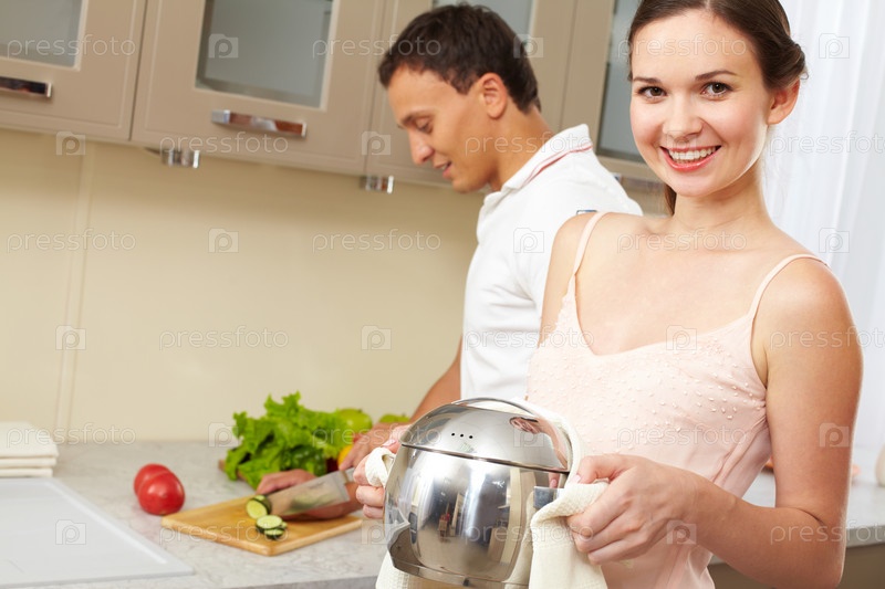 Молодая пара готовит ужин дома