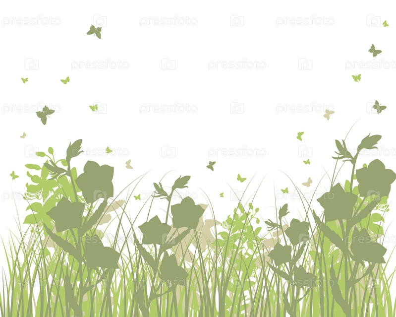 Векторный фон с травой, цветами и бабочками