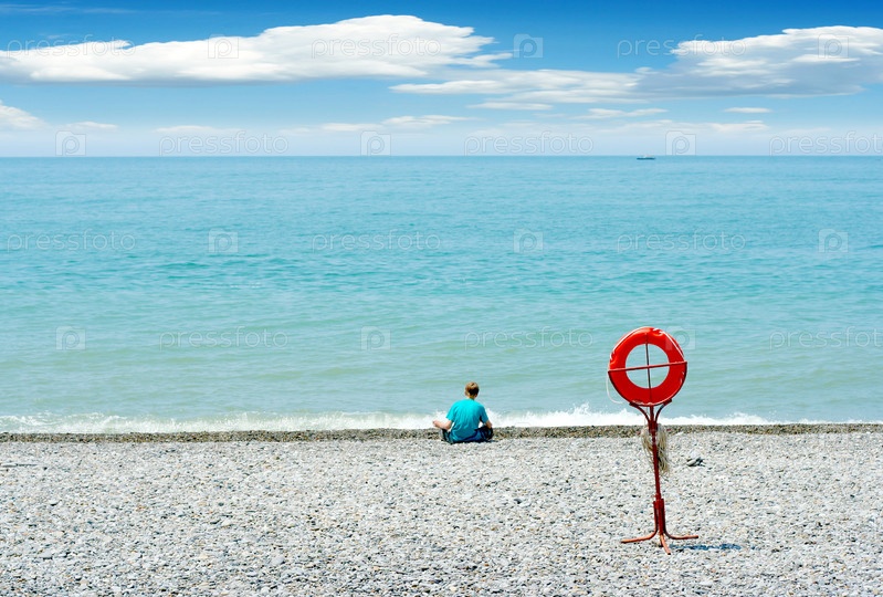 Спасательный круг, висящий на столбе на морском пляже, и мальчик, сидящий на берегу