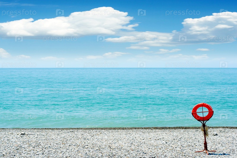 Спасательный круг, висящий на столбе на морском пляже