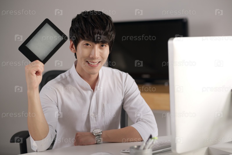 Мужчина показывает цифровой планшет