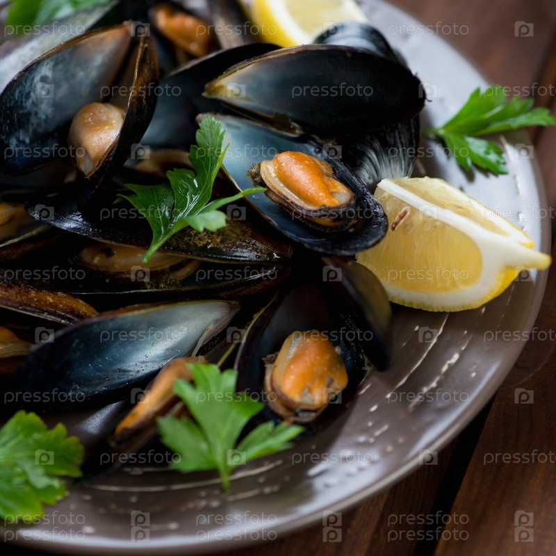 Мидии с петрушкой и лимоном, крупный план