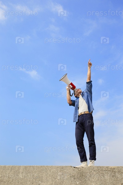 Молодой человек кричит в мегафон