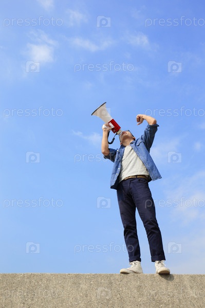 Молодой человек кричит в мегафон