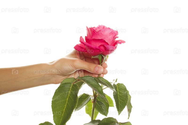 Красная роза в женской руке на белом фоне