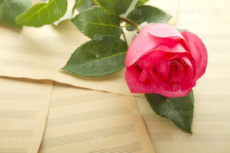 Красная роза, лежащая на старых музыкальных нотах