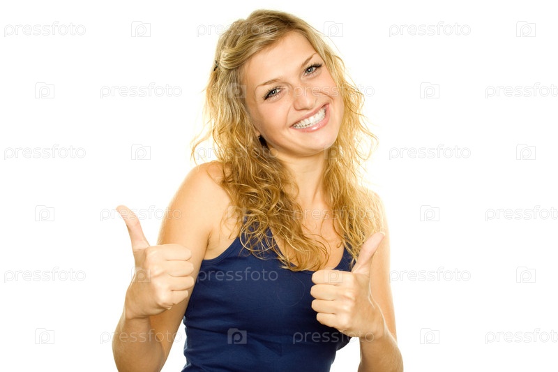 Портрет молодой девушки, показывающей большие пальцы вверх, на белом фоне