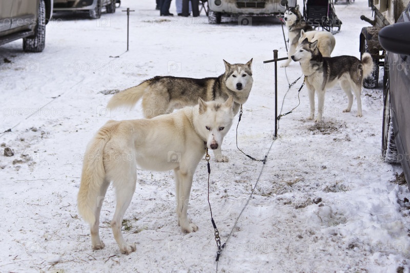 Ездовые лайки в ожидании гоночных заездов на соревнованиях