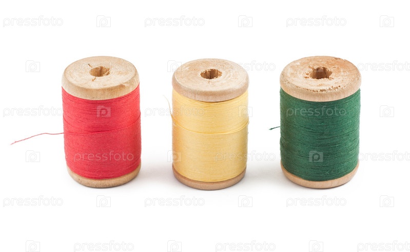 Деревянные катушки с разноцветными нитками на белом фоне