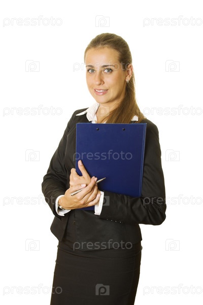 Портрет молодой девушки в деловом костюме с папкой в руках на белом фоне