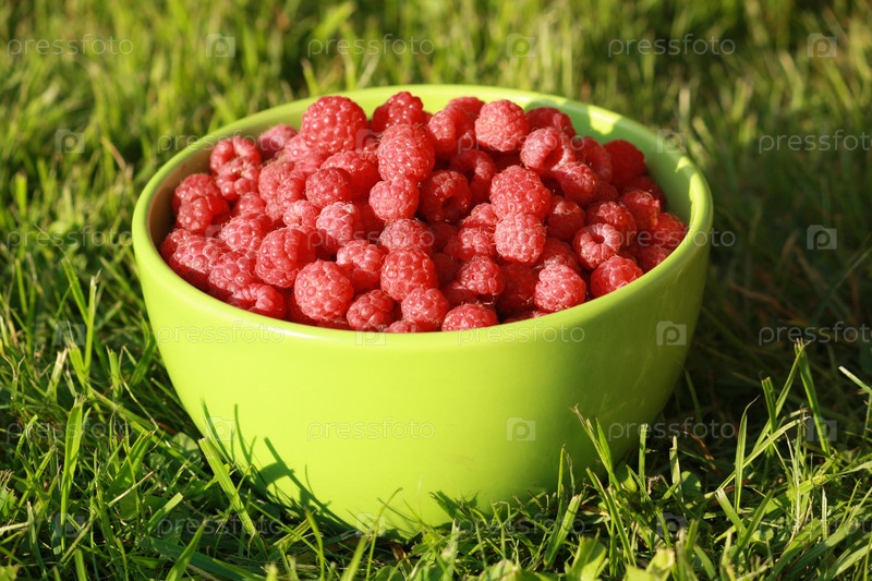 Спелая малина в миске на траве