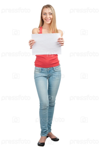 Девушка держит перед собой пустой белый плакат на белом фоне