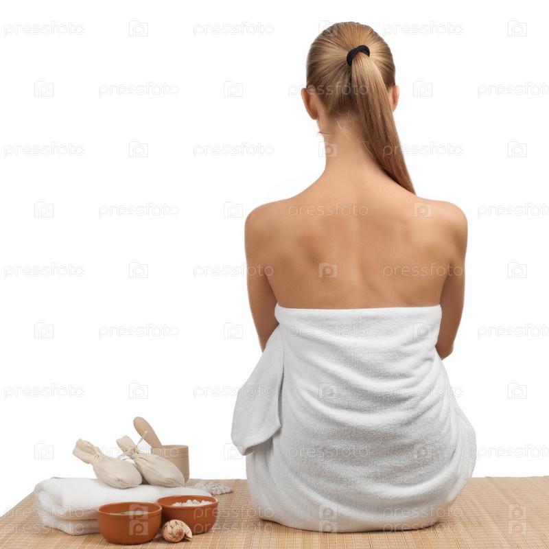 Девушка сидит на бамбуковой циновке в спа-салоне. Изолировано на белом фоне