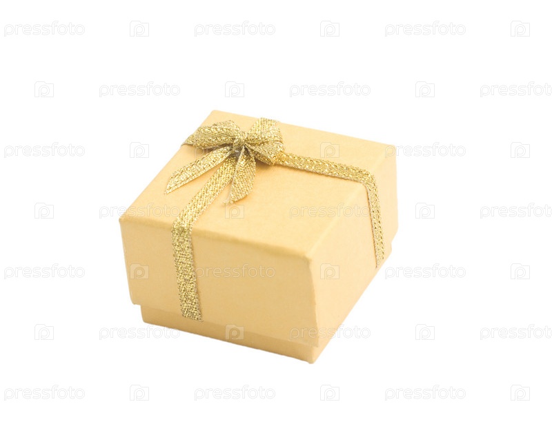 Желтая подарочная коробка с золотой лентой на белом фоне