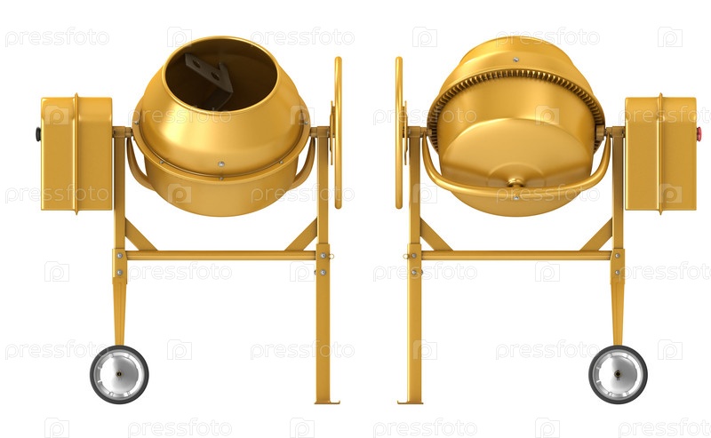 Новая желтая бетономешалка на белом фоне, вид сзади и спереди
