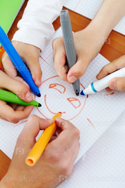 Дети рисуют фломастерами солнышко, руки крупным планом