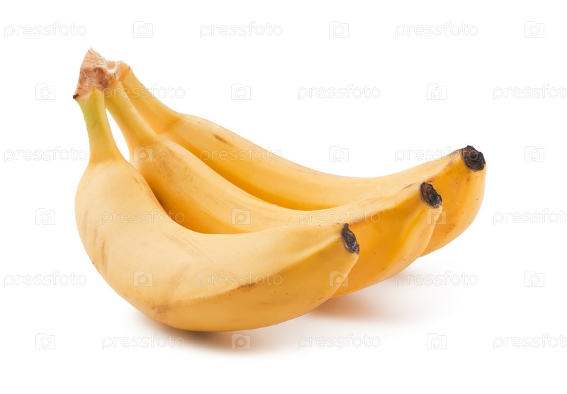 Три спелых желтых банана на белом фоне