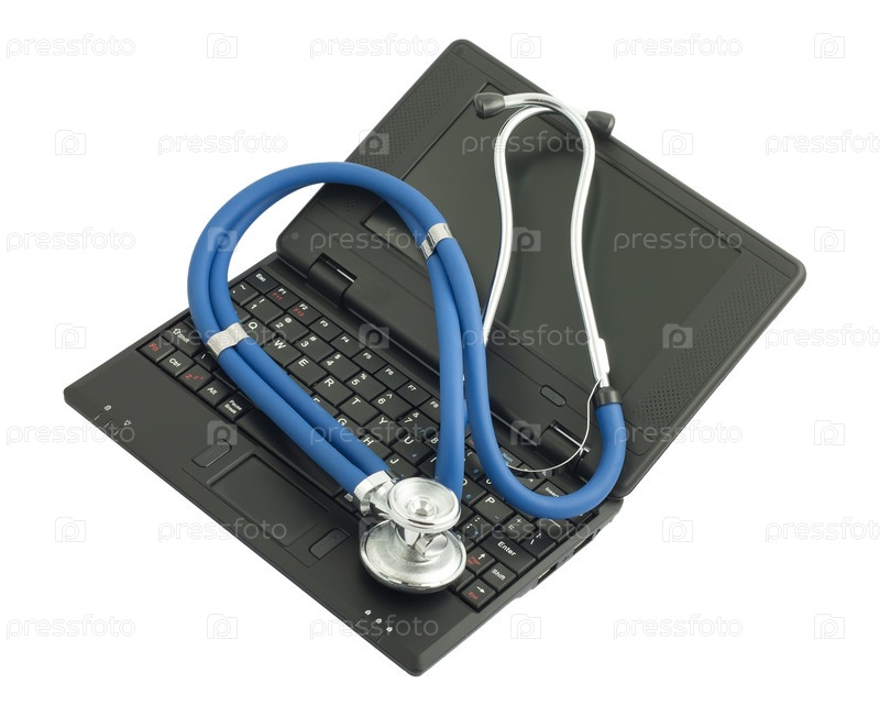 Черный нетбук и медицинский стетоскоп на белом фоне