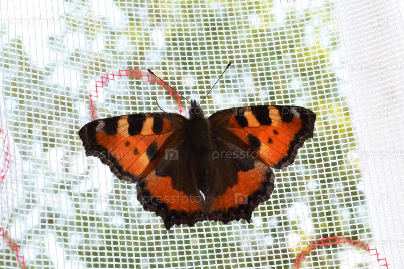 Коричневая пятнистая бабочка на тюли