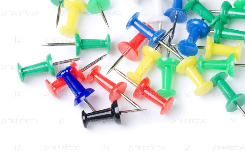 Разноцветные канцелярские кнопки на белом фоне