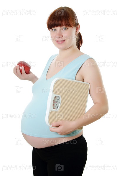 Беременная женщина с яблоком и весами на белом фоне