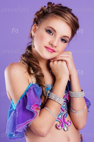 Красивая танцовщица в фиолетовом костюме