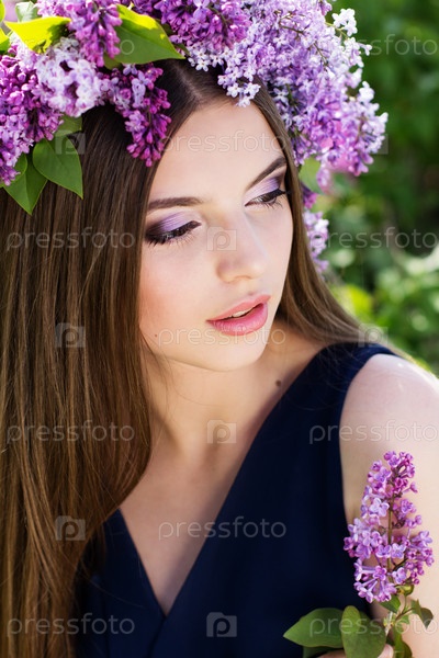 Красивая девушка с венком из цветов сирени