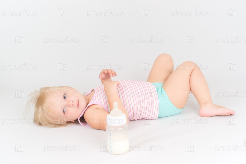 Очаровательная малышка лежит рядом с бутылочкой молока