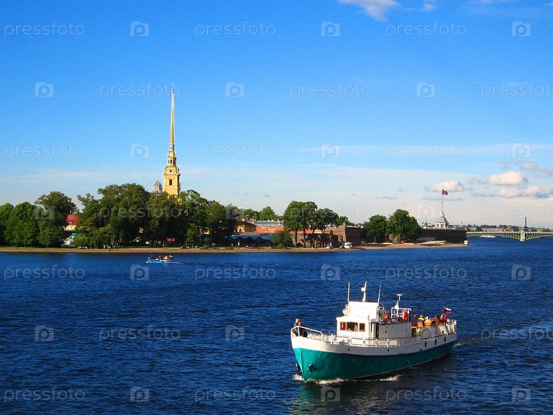 Судно плывет по воде на фоне Петропавловской крепости, Санкт-Петербург