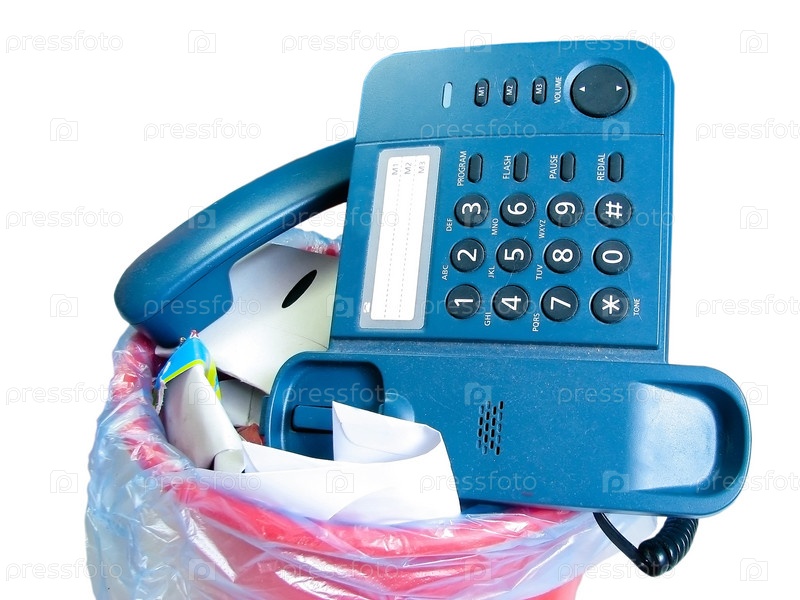 Старый телефон в мусорном ведре на белом фоне