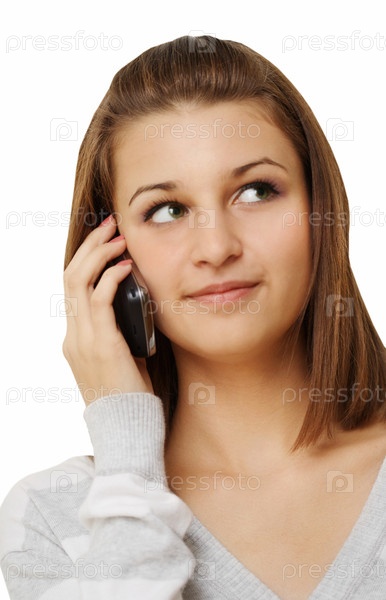 Портрет красивой девушки с мобильным телефоном, изолированная на белом фоне