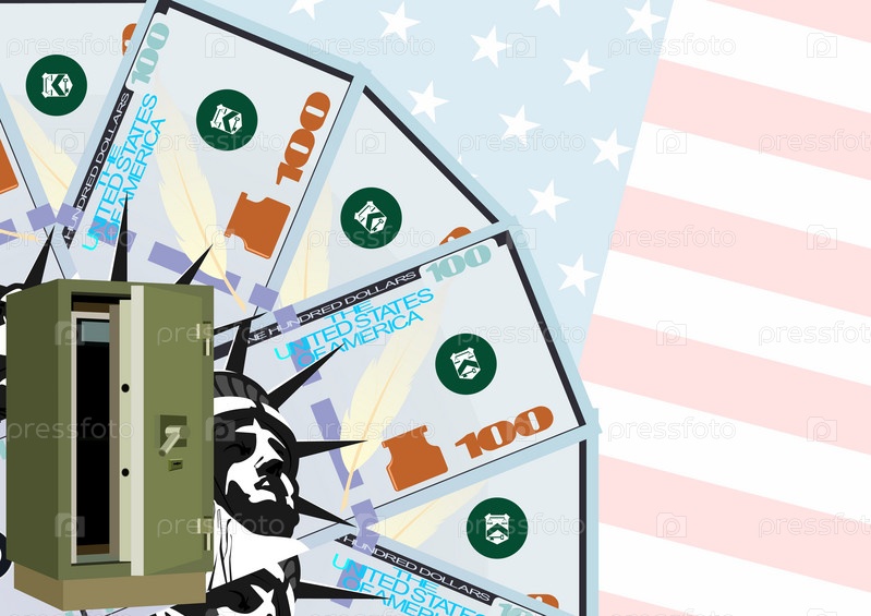Пустой сейф на фоне долларов, статуи Свободы и американского флага