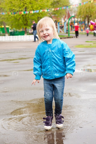 Девочка прыгает в луже