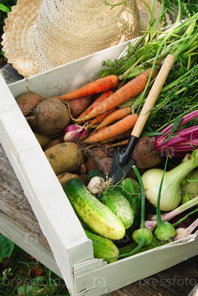 Свежие овощи в белом ящике, совок и шляпа