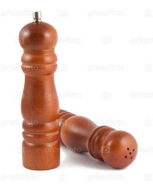 Деревянная перечница и солонка на белом фоне