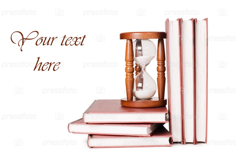 Песочные часы и книги на белом фоне